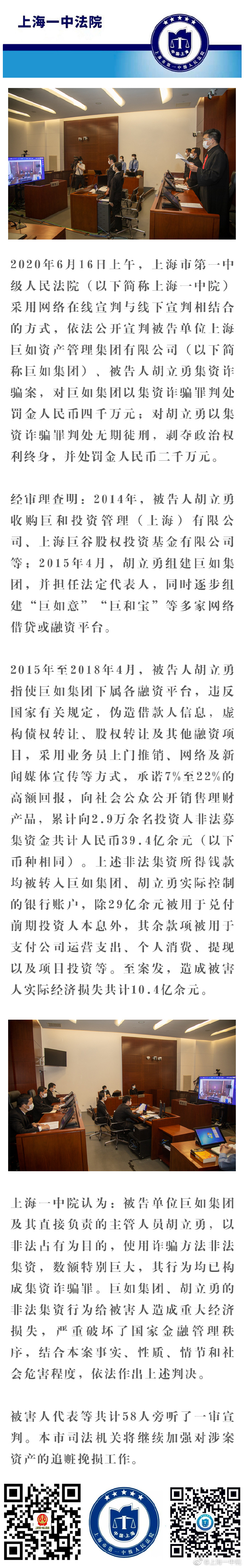 上海市第一中級人民法院官方微博@上海一中院 6月16日消息,上海一中院一審公開宣判巨如集團集資詐騙案 。