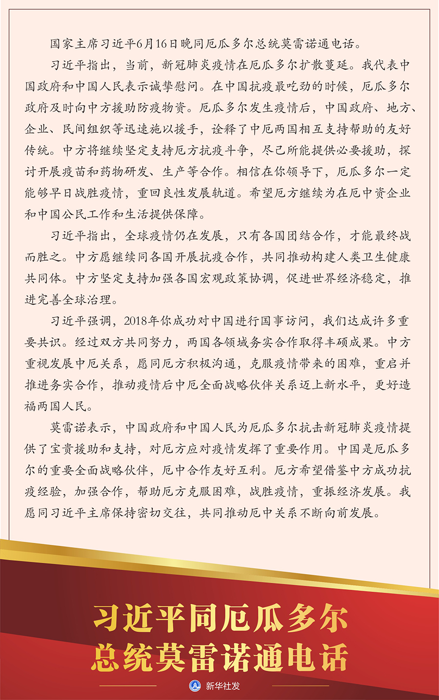 新華社北京6月16日電 國家主席習近平6月16日晚同厄瓜多爾總統莫雷諾通電話。