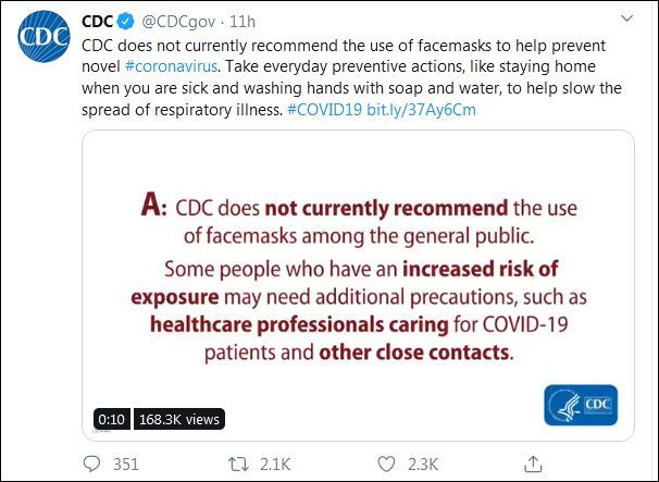 可事實上,美國疾控中心(CDC)在相當長的一段時間裏都沒有建議美國人戴口罩。2月27日,CDC發推稱,目前不建議使用口罩來預防新型冠狀病毒。就算到了4月,CDC主任羅伯特·雷德菲爾德的表態也只是他們正在“重新考慮”哪些人該戴口罩的指導原則。