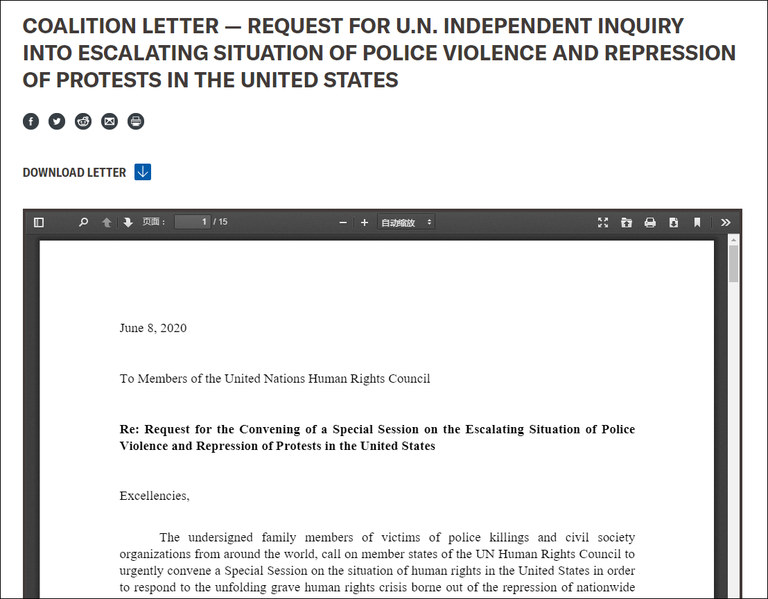 據民權權威非盈利機構“美國公民自由聯盟(ACLU)”消息,56個非洲國家中的54個已聯手向聯合國人權理事會提交一份決議草案,請求聯合國介入調查美國及其他國家對非裔族羣的系統性種族歧視、警察暴力執法等問題。
