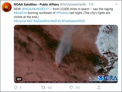 氣象衞星在23000英里(約37015千米)高度拍攝的山火,推特截圖