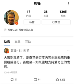 (觀察者網 文/易佳穎)6月17日,針對外媒報道的“百度向騰訊出售愛奇藝股權”一事,百度公關總監郭鋒在百度App上發表動態回應稱:“大家別亂猜了。愛奇藝是百度內容生態略的重要組成部分,百度會一如既往地支持愛奇藝的發展。”