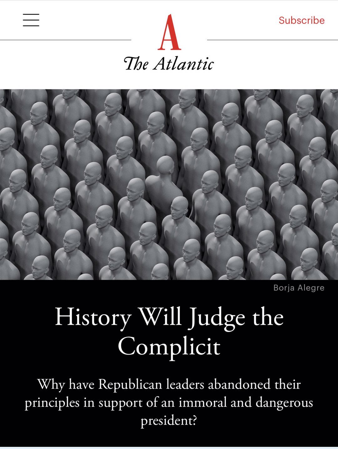 **賈敏:**大西洋月刊這篇文章的作者Anne Applebaum是一位波蘭裔作家,曾寫過《古拉格》、《鐵幕》等暢銷作品,在推特上一直批評痛罵特朗普。在我看來,這篇文章其實是在討論2016年以來共和黨人到底是權宜之計,還是真的甘心讓共和黨徹底“特朗普”化。