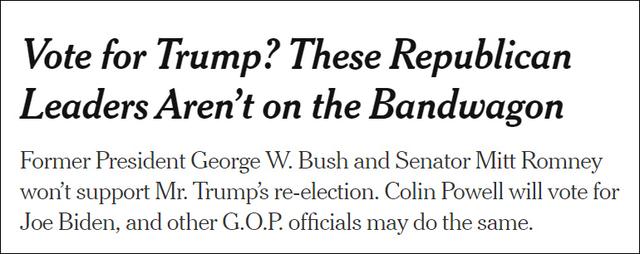 實際上,共和黨內部的分裂從2017年美國大選結果揭曉後就存續至今。尤其是,去年年底美國非常著名的一份福音派雜誌《今日基督教》(Christian Today)公開發文反對特朗普引發軒然大波。紐約時報也刊登過共和黨內部林肯聯盟的反特朗普檄文,其標題為“我們是共和黨人,我們決心擊敗特朗普”,從道德高度和政治操守方面,呼籲黨內同仁與特朗普儘快切割,從國家利益角度寧願把票投給民主黨。這種表態其實在弗洛伊德事件後已經不斷在發酵,多位共和黨資深人士都公開宣佈將投票給拜登,星星之火,可以認為正在密切燎原之中。