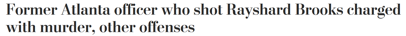 5天后,當地時間6月17日,《華盛頓郵報》報道稱,亞特蘭大富爾頓(Fulton)縣檢察官保羅·霍華德(Paul Howard)宣佈,他已決定向在雷沙德·布魯克斯(Rayshard Brooks)案中的前警察加勒特·羅爾夫(Gareett Rolfe)“發出逮捕令”,並對其提起11項起訴,包括以致命武器加重毆打、違反其宣誓就職以及謀殺罪的指控。
