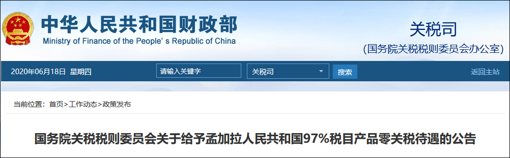 國務院關税税則委員會:給予孟加拉人民共和國97%税目產品零關税待遇