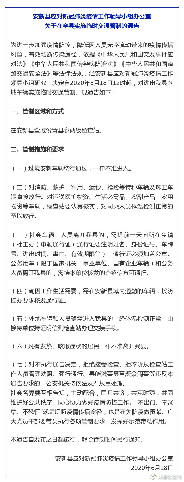 據河北雄安新區管理委員會官方微博@雄安發佈 6月18日消息,今天,安新縣應對新冠肺炎疫情工作領導小組辦公室發佈通告,經安新縣應對新冠肺炎疫情工作領導小組研究,決定自2020年6月18日12時起,對進出安新縣區域車輛實施臨時交通管制。