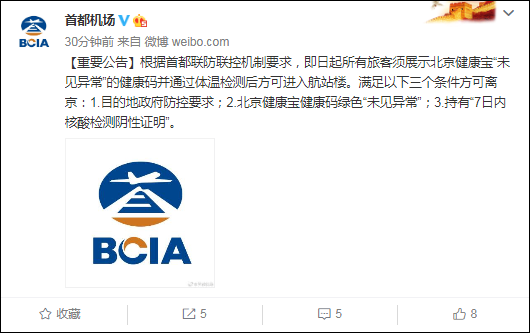 北京首都國際機場官方微博(@首都機場 )6月18日發佈公告,根據首都聯防聯控機制要求,即日起所有旅客須展示北京健康寶“未見異常”的健康碼並通過體温檢測後方可進入航站樓。滿足以下三個條件方可離京:1.目的地政府防控要求;2.北京健康寶健康碼綠色“未見異常”;3.持有“7日內核酸檢測陰性證明”。