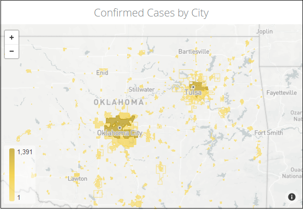 該州疫情地圖顯示,最嚴重的地區就是首府俄克拉何馬城與塔爾薩市 圖片來源:俄克拉荷馬州衞生部門