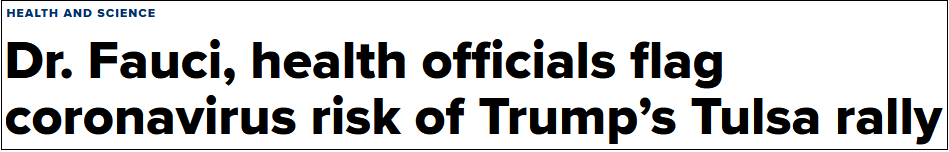 16日福奇在接受《每日野獸報》採訪時,被問及是否會參加這場競選集會,今年79歲的他否認道:“不,我屬於高危人羣。就我個人而言,我不會去參加。當然不會。”而出生於1946年6月14日的特朗普也屬於高危人羣,四天前才過完他的74歲生日。15日他還在推特上吹噓道:“近100萬人要購買我週六晚上塔爾薩集會的門票!”
