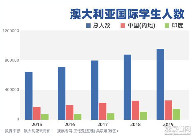 據澳大利亞教育部數據,2019年中國內地在澳留學人數達26.1萬人,佔澳大利亞國際學生總數的27.3%,穩居第一,貢獻了該國國際教育總收入的約三分之一。儘管相較於前幾年,中國赴澳留學生數量增長速度已逐漸放緩,但和位列第二的印度相比,人數仍高出近一倍。