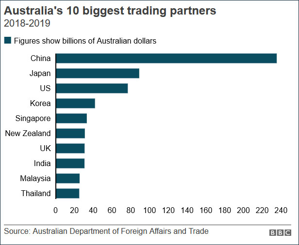 澳大利亞前十大貿易伙伴排名,包括中國、日本、韓國、印度等國。 來源:BBC