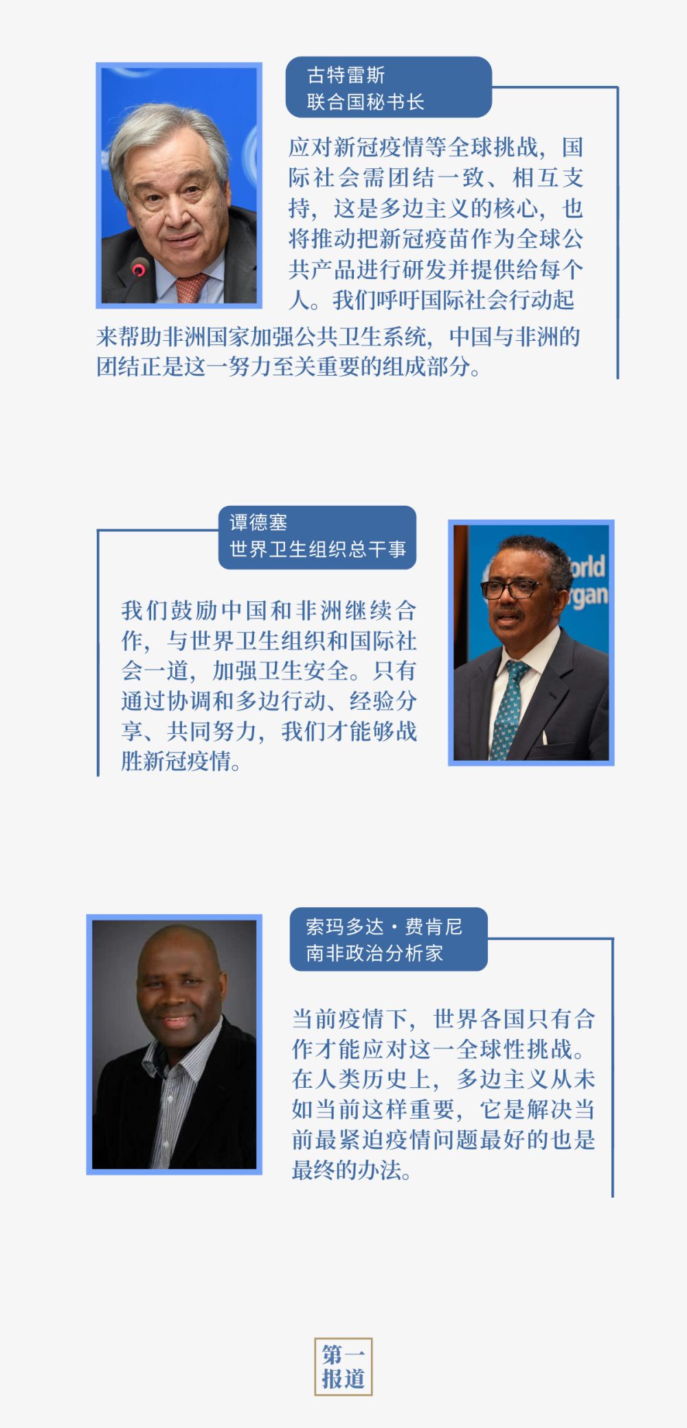在此次峯會上,習主席提出四個“堅定不移”,為中非抗疫合作指明方向,為中非關係未來擘畫藍圖。一句句真誠倡議、一項項務實舉措,讓非洲國家感受到兄弟無遠的中國情誼,讓國際社會感受到團結抗疫的中國擔當。