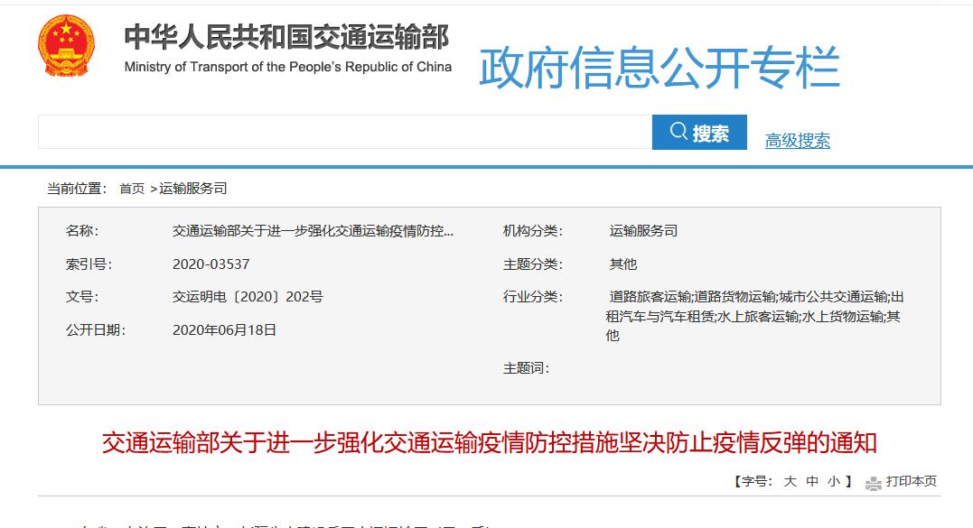 6月18日,交通運輸部下發《關於進一步強化交通運輸疫情防控措施堅決防止疫情反彈的通知》。