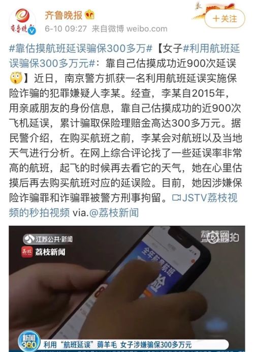 最近南京警方發現以李某以買理財為由從親朋好友處騙來身份信息和銀行卡信息,根據自己的判斷購買延遲率大的航班並投保延誤險,為了更具隱蔽性以逃避系統核查,李某每次購買機票都用4、5個身份,成功索賠累計900多次,理賠金額高達300萬,而這些錢最終都進了李某的賬户,最後被警方發現,立案處理。
