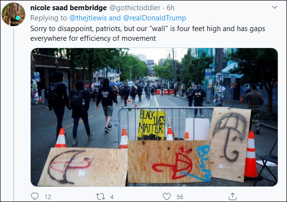 特朗普於當地時間6月18日在推特上這樣寫道:“那些無政府主義者在佔領西雅圖後乾的第一件事就是‘建牆’。看,我走在了時代的前沿!”