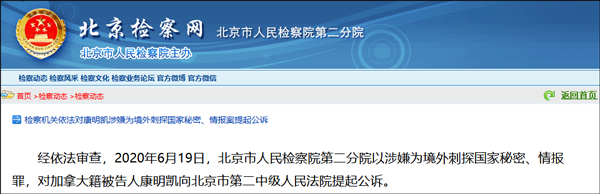 據北京檢察網6月19日消息,經依法審查,2020年6月19日,北京市人民檢察院第二分院以涉嫌為境外刺探國家秘密、情報罪,對加拿大籍被告人康明凱向北京市第二中級人民法院提起公訴。