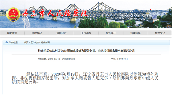 據丹東市人民檢察院網站6月19日消息,經依法審查,2020年6月19日,遼寧省丹東市人民檢察院以涉嫌為境外刺探、非法提供國家秘密罪,對加拿大籍被告人邁克爾·斯帕弗向丹東市中級人民法院提起公訴。