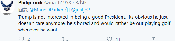 “特朗普對當好總統不感興趣,很明顯他什麼都不在乎,他感到很無聊寧願出去打高爾夫球。”