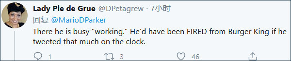 “特朗普正忙着‘工作’呢。像他這樣頻繁發推特,怕是早就被漢堡王炒掉了。”