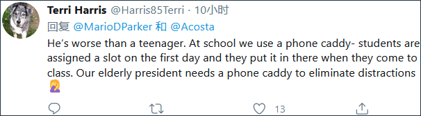 “他比小孩子還糟糕。學校的學生都有自己的手機暫存處,把手機放好後學生們才去上課。我們年邁的總統也需要這麼一個地方,以免分散注意力。”
