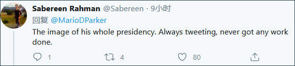“這張圖就是特朗普整個總統生涯的寫照:一直髮推特,從沒搞定過任何工作。”