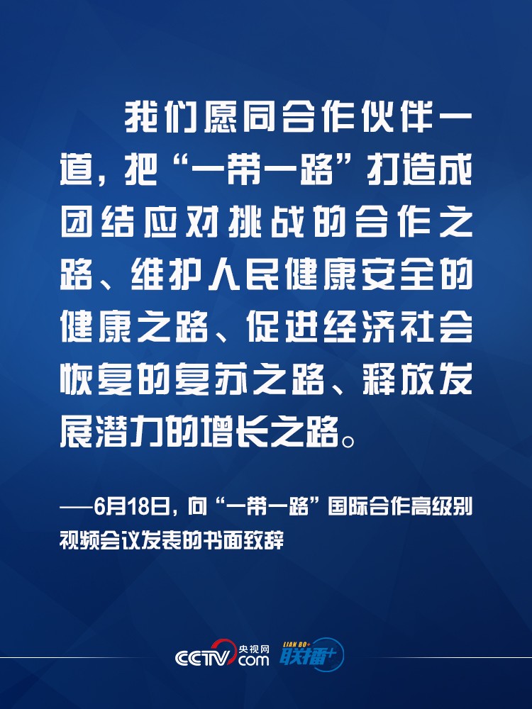 把“一帶一路”打造成團結應對挑戰的合作之路、維護人民健康安全的健康之路、促進經濟社會恢復的復甦之路、釋放發展潛力的增長之路。
