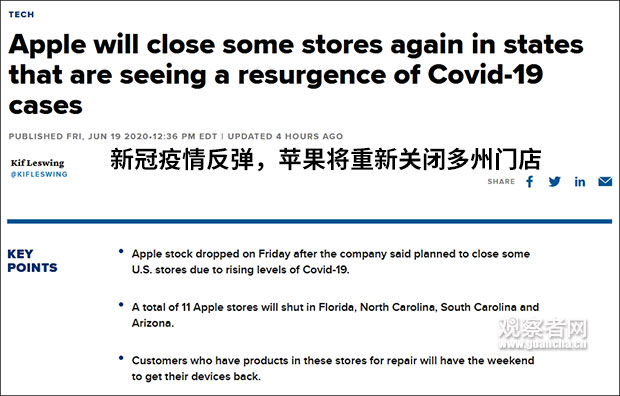 蘋果公司在美東時間午間宣佈,將重新關閉位於佛羅里達州、亞利桑那州、南卡羅來納州和北卡羅來納州的11家門店。今年3月,蘋果因疫情暴發而關閉這些門店,之後所有門店都一度重開。蘋果公司股價同樣高開低走,接近開盤時曾上漲1.46%,但以下跌0.57%報收,盤中最大跌幅1.71%。
