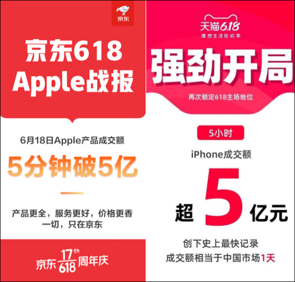 幾乎同時,國內“6·18”大促正在收官,媒體紛紛報道了蘋果在中國市場首次正式參加促銷的初步成績單。據稱,在京東,蘋果品牌刷出5秒成交過億,5分鐘成交過5億的紀錄,iPhone 11高居手機銷售榜單第二名;在天貓,iPhone在開場5小時之後刷出銷售額超5億。可謂再次上演“東邊日出西邊雨”。