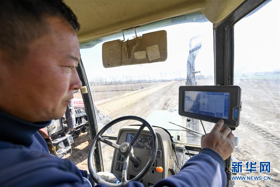 在位於寧夏吳忠市利通區金積鎮塔灣村的智慧農業科技示範區,農機手在播種前調試自動駕駛拖拉機(2020年4月9日攝)。新華社記者 馮開華 攝
