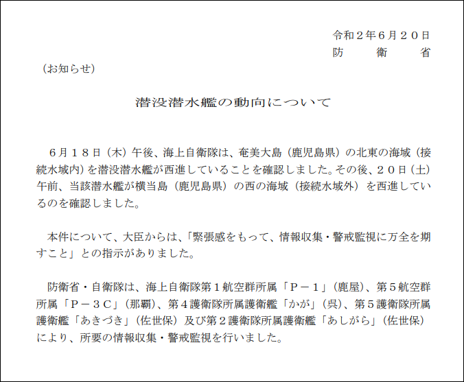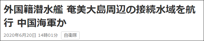 日本防衞省6月20日發佈消息稱,6月18日下午,海上自衞隊在鹿兒島縣奄美大島東北方向連接水域發現有外國潛水艇潛水向西行駛。經確認該潛艇於20日上午離開連接水域,在東海向西航行。沒有侵入日本領海。