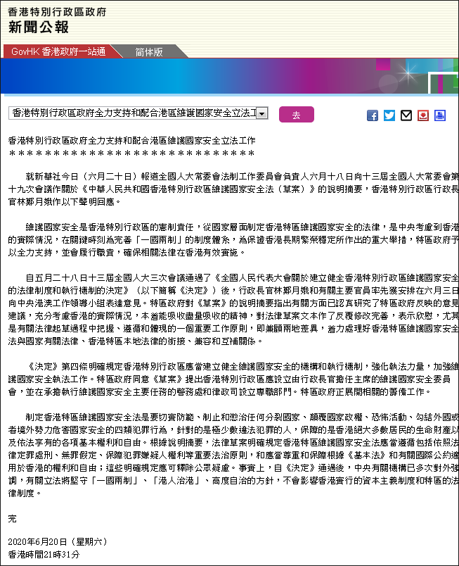 香港特區政府網站20日晚間發佈公報《香港特別行政區政府全力支持和配合港區維護國家安全立法工作》,以下為公報全文: