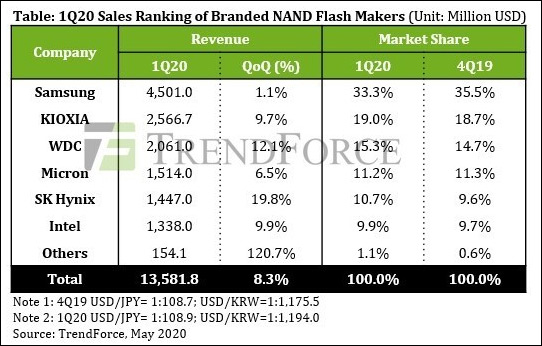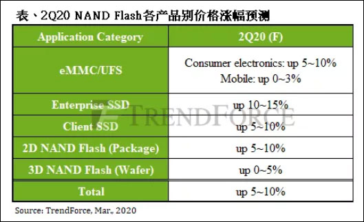 3月底,集邦諮詢半導體研究中心(DRAMeXchange)的調查顯示,雖然新冠疫情蔓延,使得2020年第一季度的終端產品出貨動能格外疲弱,但在閃存(NAND Flash)領域,由於2020年全年供給收縮,加上各大供應商資本支出保守,第一季NAND Flash均價在淡季仍上漲約5%。