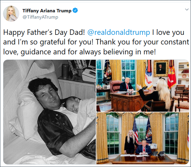 小女兒蒂芙尼(Tiffany Ariana Trump)説:“我愛您爸爸!我非常感激您,感謝您源源不斷的愛,您的指導和信任!”她附上了三張圖,其中一張是父親抱着嬰兒時期的她,另兩張則是父女倆在白宮辦公室的合影。