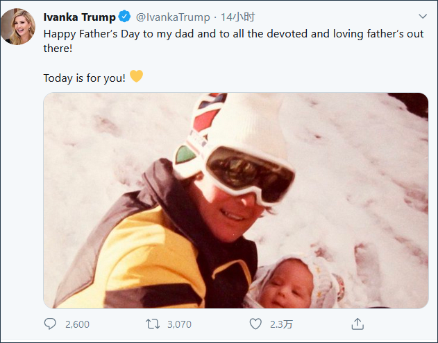 特朗普的大女兒伊萬卡在推特上發推説:“祝我的父親及所有甘於奉獻和慈愛的父親節日快樂!今天是你們的!”她還附上了一張父親抱着小時候自己的照片。