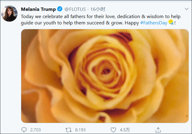 特朗普夫人梅拉尼婭當天也發推慶祝了父親節,她發佈了一張黃色玫瑰的照片,但配文並沒有提到丈夫特朗普。