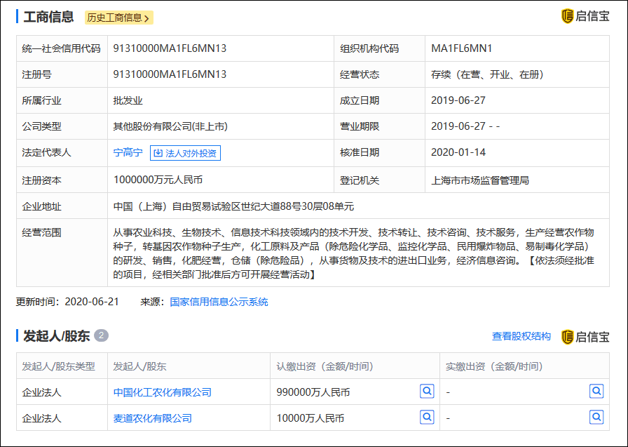 觀察者網查詢啓信寶發現,中農科技在2019年6月成立於上海,註冊資本金100億元,由“兩化”董事長寧高寧擔任董事長、總經理以及公司法人,中國化工集團的全資子公司中國化工農化有限公司持有其99%股份,另外1%股份由中國化工農化有限公司的全資子公司麥道農化有限公司持有。