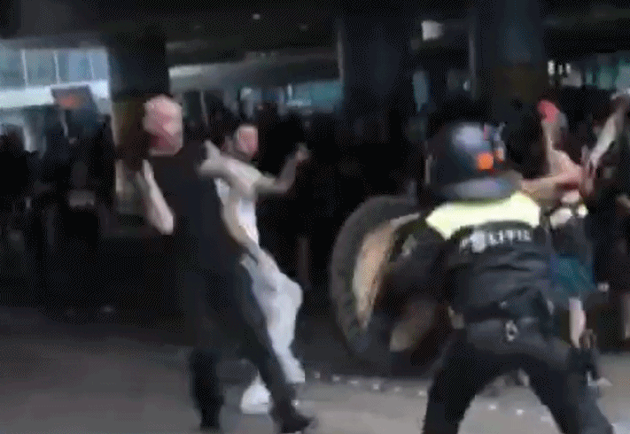 據海牙警方消息,示威活動結束不久後,“騷亂爆發”,一羣“足球流氓”與警察發生暴力衝突。警方動用水炮車和騎警驅散人羣,並逮捕約400人。