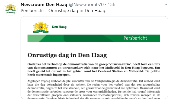 海牙市政府發言人在聲明中稱,此次抗議最初是被禁止的,原因是擔心抗議者違反社交隔離措施、以及可能會引發騷亂。但最終,市政府批准了在馬利埃德沿線進行短暫(下午1點至1點半)示威。