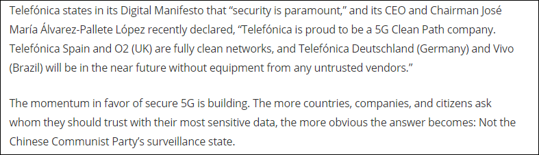 蓬佩奧憑空捏造出一個概念——“乾淨的電信公司”(Clean Telcos)。他妄稱“全球電信運營巨頭們正在轉型成‘乾淨的電信公司’”,言下之意“只要選擇華為就是不乾不淨”,毫無道理可講。