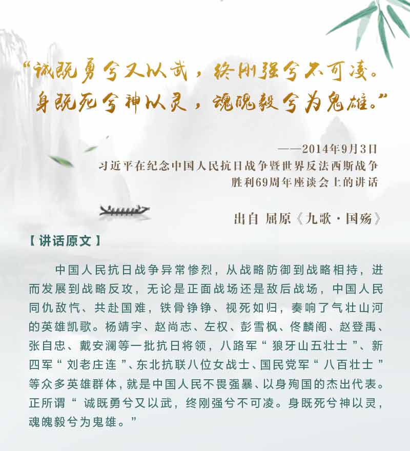 2014年9月3日,在紀念中國人民抗日戰爭暨世界反法西斯戰爭勝利69週年座談會上,習近平緩緩念出屈原的傳世名句,“誠既勇兮又以武,終剛強兮不可凌。身既死兮神以靈,魂魄毅兮為鬼雄”,盛讚中國人民同仇敵愾、共赴國難,鐵骨錚錚、視死如歸,奏響了氣壯山河的英雄凱歌。