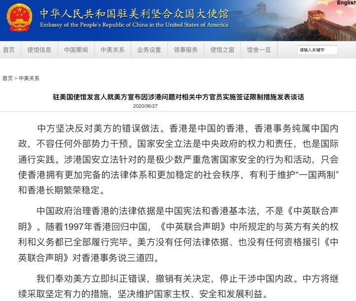6月27日,中國駐美國大使館官網刊發《駐美國使館發言人就美方宣佈因涉港問題對相關中方官員實施簽證限制措施發表談話》。