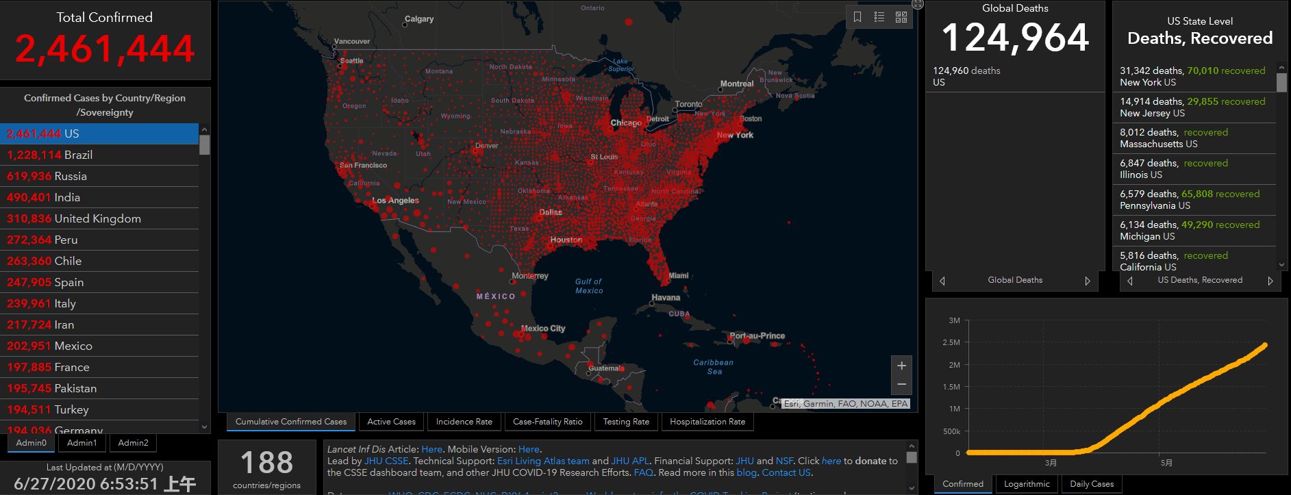 (觀察者網訊)據約翰斯·霍普金斯大學發佈的全球新冠肺炎數據,截至北京時間6月27日6時53分(美東時間6月26日18時53分),美國新冠肺炎累計確診病例2461444例,累計死亡病例124964例。