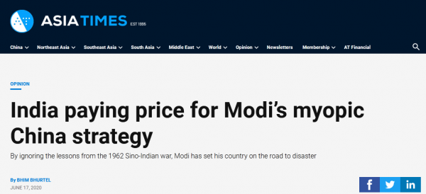 6月17日《亞洲時報》刊文《印度為莫迪短視的中國戰略付出代價》