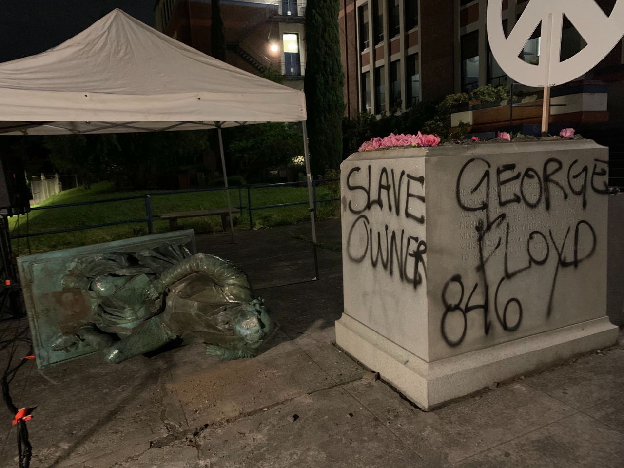 14日,美國波特蘭市被推倒的美國“國父”傑斐遜雕像 社交媒體圖