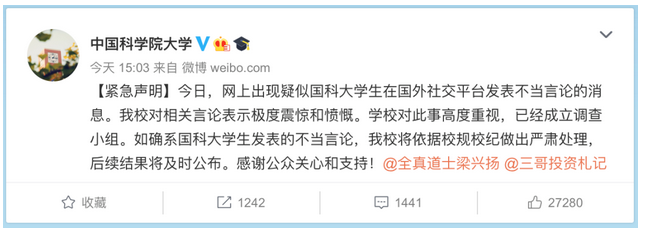 下午15時,@中國科學院大學發佈緊急聲明:今日,網上出現疑似國科大學生在國外社交平台發表不當言論的消息。我校對相關言論表示極度震驚和憤慨。學校對此事高度重視,已經成立調查小組。如確係國科大學生髮表的不當言論,我校將依據校規校紀做出嚴肅處理,後續結果將及時公佈。感謝公眾關心和支持!
