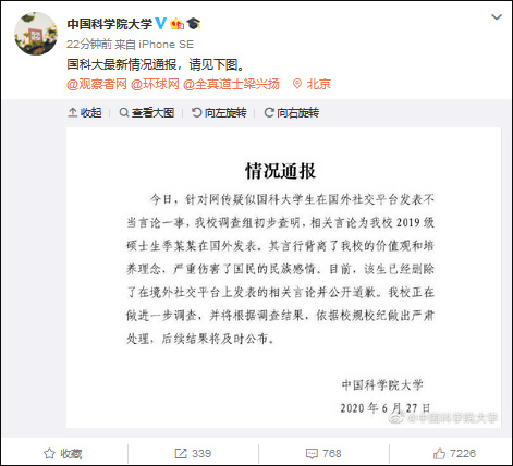 剛剛,中國科學院大學微博發佈“情況通報”:今日,針對網傳疑似國科大學生在國外社交平台發表不當言論一事,我校調查組初步查明,相關言論為我校2019級碩士生季某某在國外發表。其言行背離了我校的價值觀和培養理念,嚴重傷害了國民的民族感情。目前,該生已經刪除了在境外社交平台上發表的相關言論並公開道歉。我校正在做進一步調查,並將根據調查結果,依據校規校紀做出嚴肅處理,後續結果將及時公佈。