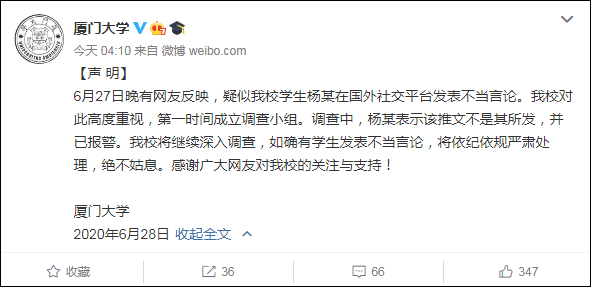 廈門大學官方微博(@廈門大學)6月28日發佈聲明,6月27日晚有網友反映,疑似我校學生楊某在國外社交平台發表不當言論。我校對此高度重視,第一時間成立調查小組。調查中,楊某表示該推文不是其所發,並已報警。我校將繼續深入調查,如確有學生髮表不當言論,將依紀依規嚴肅處理,絕不姑息。感謝廣大網友對我校的關注與支持!