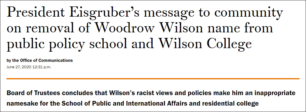 “普林斯頓大學的學者、學生與校友都必須堅決反對任何形式的種族主義,校董會認定伍德羅·威爾遜的種族主義觀點與政策,使他不適合成為學院的命名。”