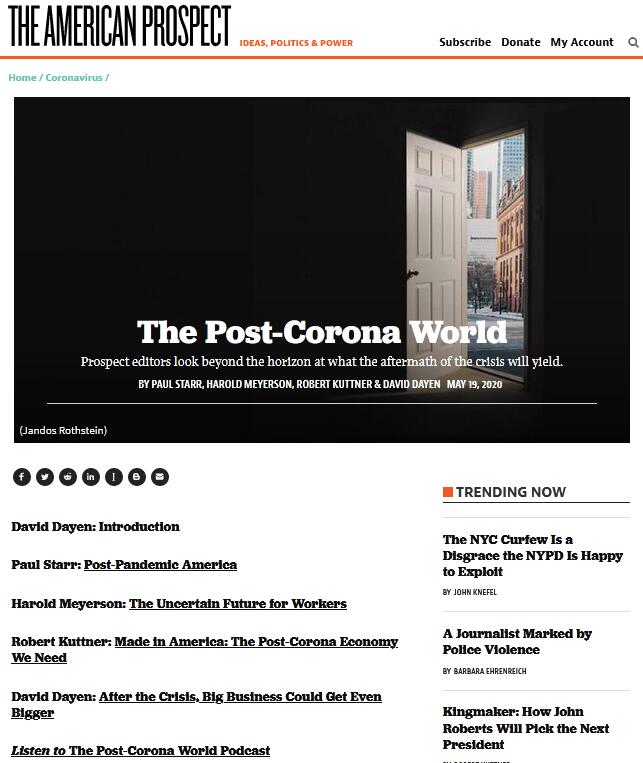 **羅伯特·庫特納(創辦人、聯合主編):**我可以問題一個問題嗎?在封面特輯中,保羅談論的是比較宏觀的社會問題,哈羅德談了勞工問題,大衞談了公司監管、金融業以及紓困資金濫用等問題,而我本人談的是我們將迎來大規模公共投資的契機,我感覺你們三位比我要悲觀一些。大家覺得美國在政治領域發生怎樣的變化才能夠讓勞工、公共醫療衞生體系以及反壟斷等問題的解決走上正確的軌道呢?
